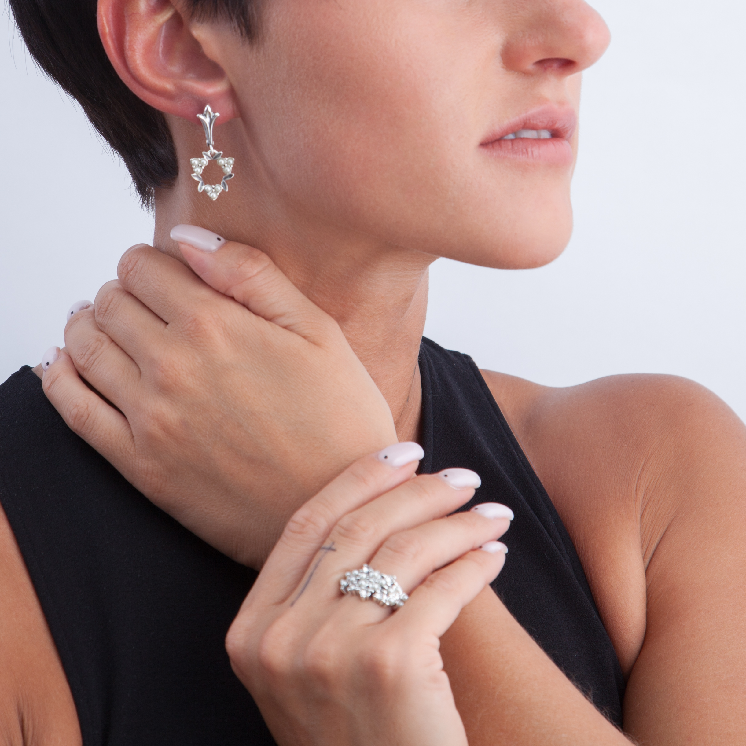 Жемчуг и прозрачные кристаллы Swarovski в обрамлении черненого серебра создают иллюзию сада, тронутого первыми заморозками. Спокойные оттенки серого и белого хорошо впишутся в яркую цветную гамму, которую предлагают нам дизайнеры ведущих модных домов.