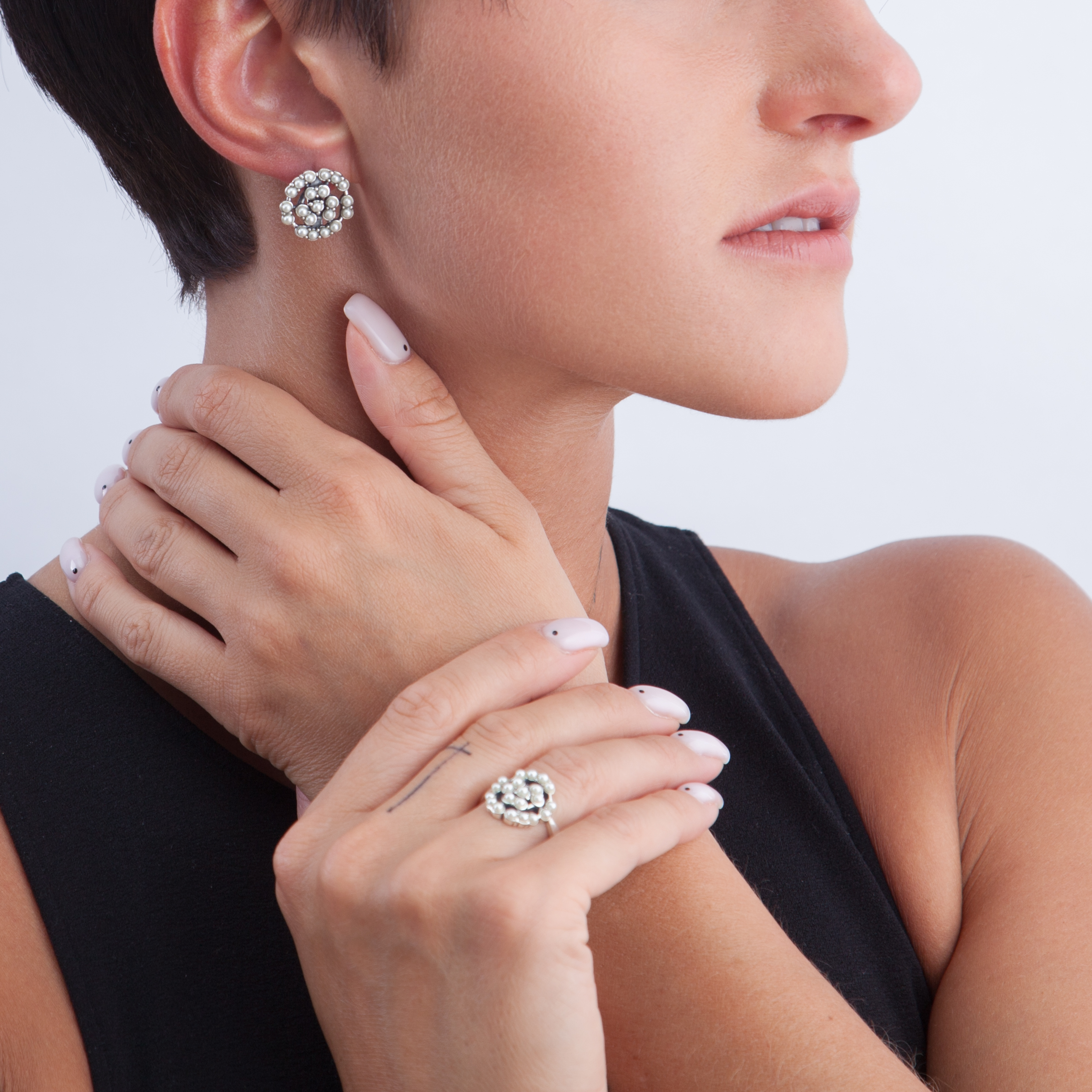 Жемчуг и прозрачные кристаллы Swarovski в обрамлении черненого серебра создают иллюзию сада, тронутого первыми заморозками. Спокойные оттенки серого и белого хорошо впишутся в яркую цветную гамму, которую предлагают нам дизайнеры ведущих модных домов.