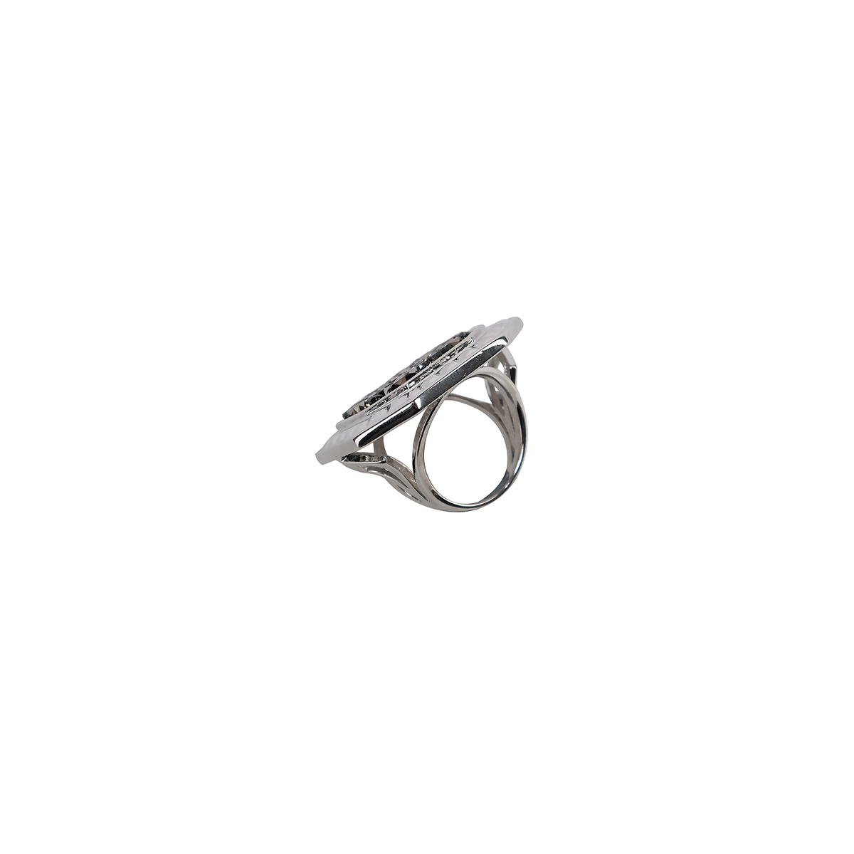 Без того примечательное шестиугольное кольцо Греста к тому же привлекает сверкающим тиснением похожим на вставку лунной породы.
