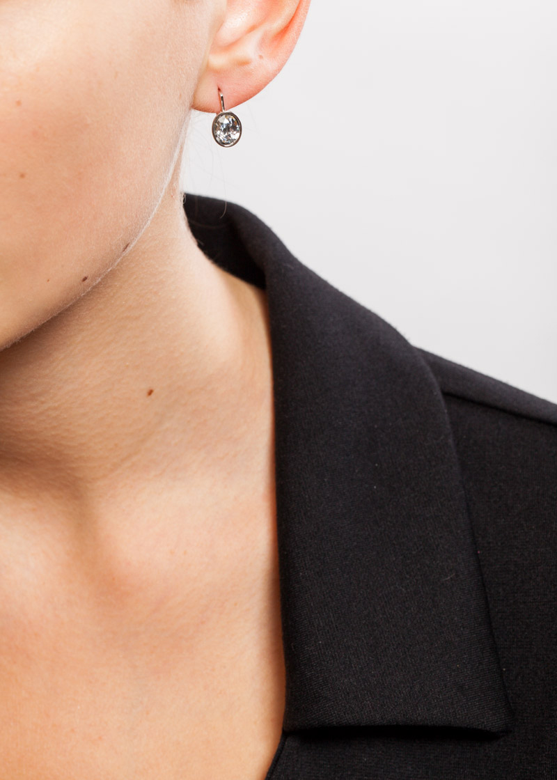 Дизайн этих сережек очень прост, но именно в этом их очарование: кристаллы Swarovski овальной формы с их роскошным сиянием, минимум деталей и великолепный холодный блеск, который дает металлу родиевое покрытие.