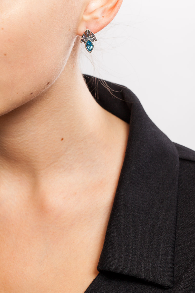 Серьги Ноттингем – для тех, кто любит настоящую европейскую элегантность. В этом украшении есть геральдические мотивы, утонченность и благородство. Черненое серебро, голубые камни в форме лепестка и россыпь белых камешков поменьше вместе создают изумительный женственный ансамбль. А сияние кристаллов Swarovski не спутать ни с чем!